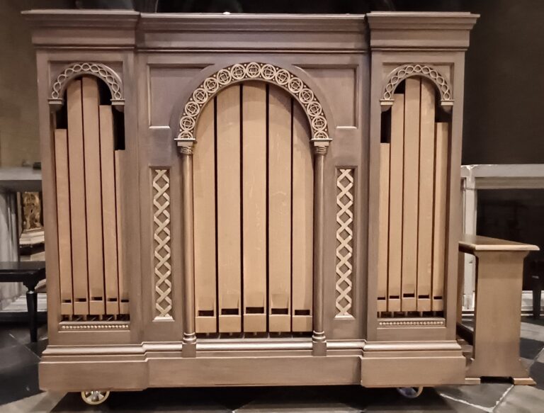 Een orgel op het koor, dat ook bij vespers te gebruiken is en derhalve verrijdbaar is.