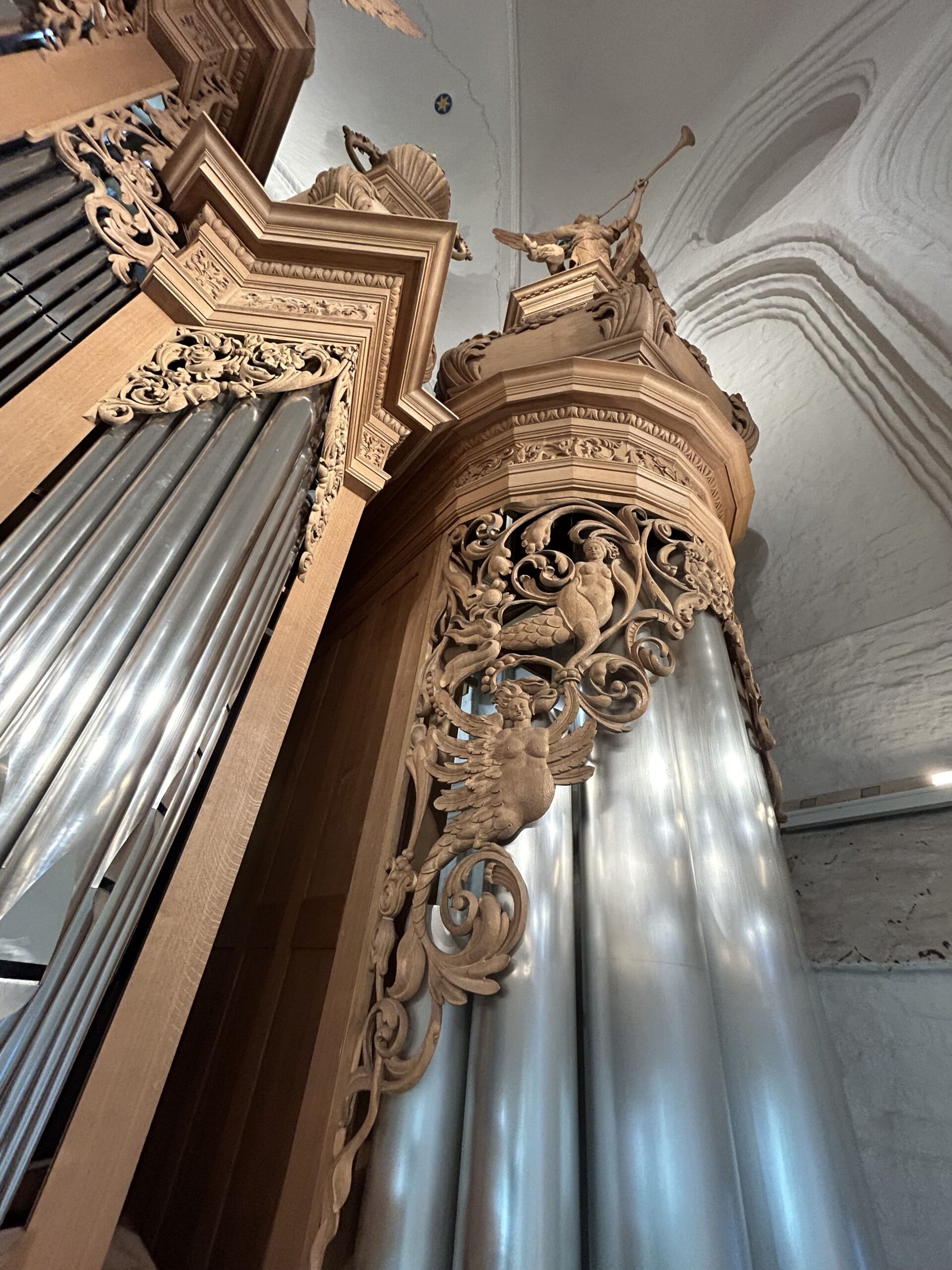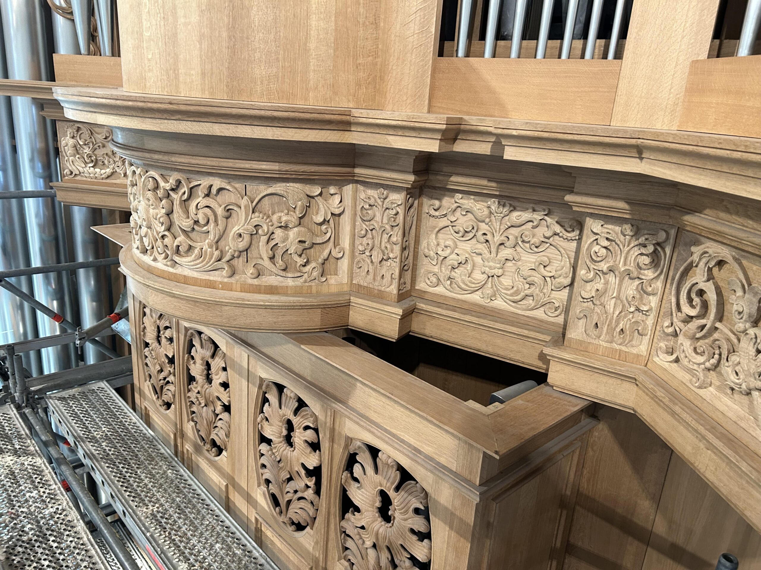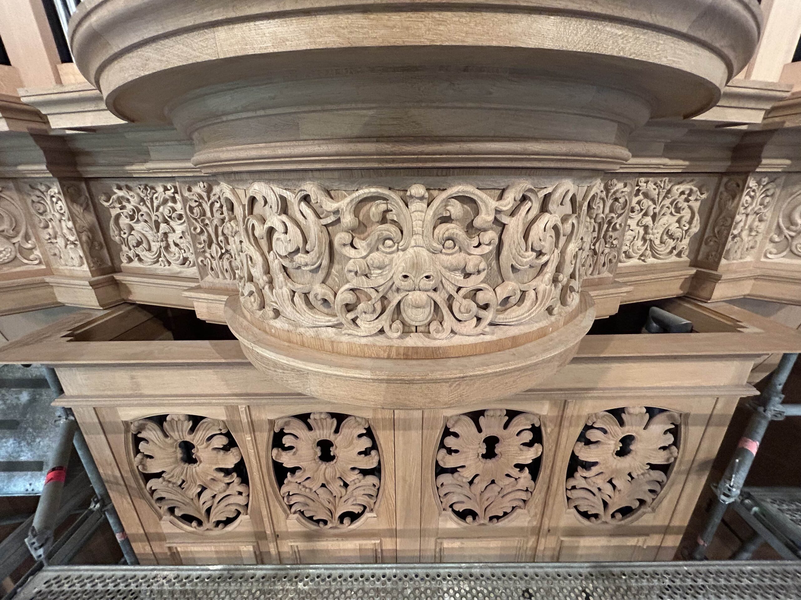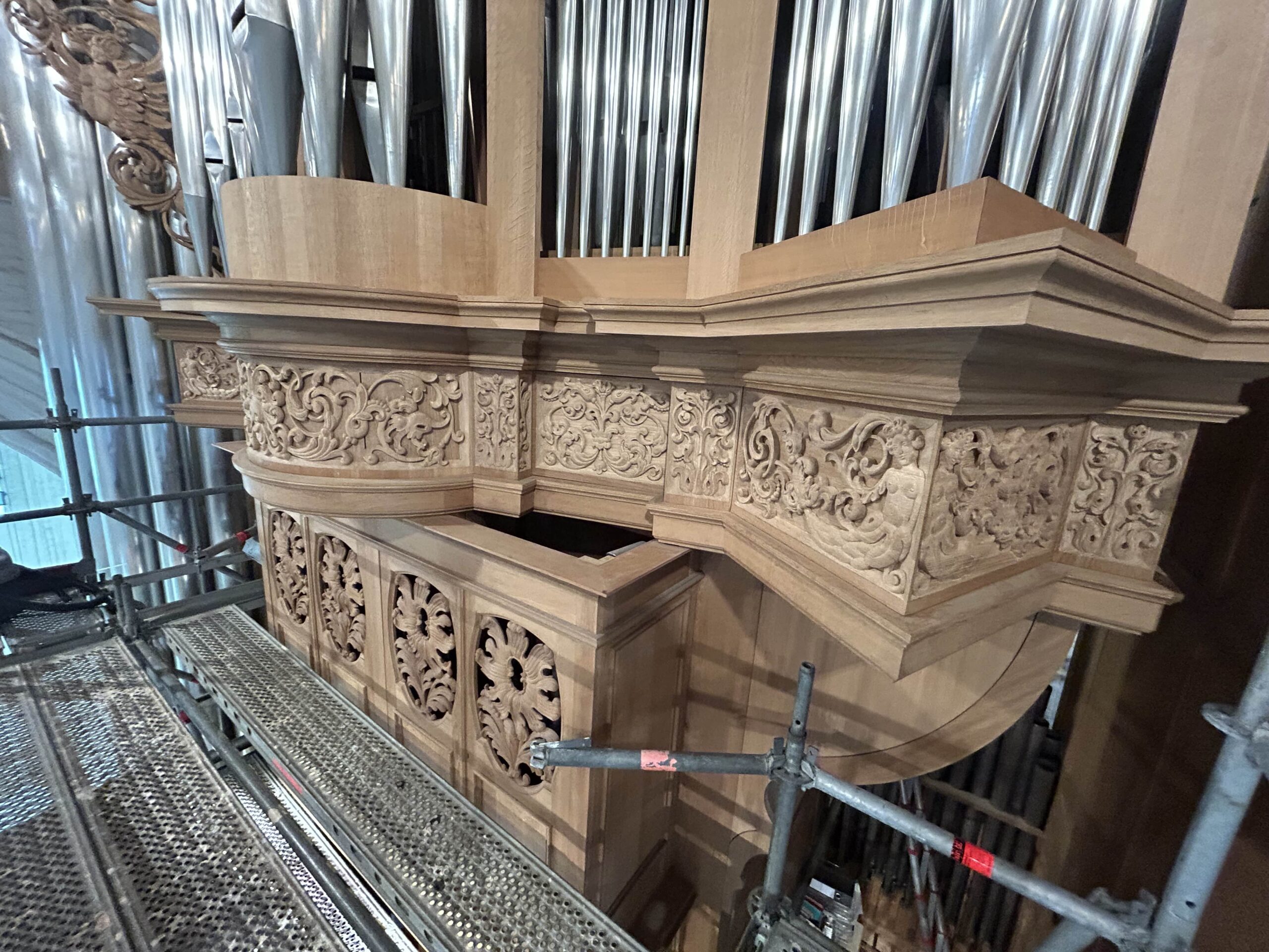 Oktober 2024 maakte Christiane Sandler het nog ontbrekende snijwerk in de Fries onder het Hoofdwerk af (zie foto’s). Flentrop monteerde het. Op een aantal plaatsen ontbreekt nog snijwerk dat de kas in 1605/1631/1674 wel had.